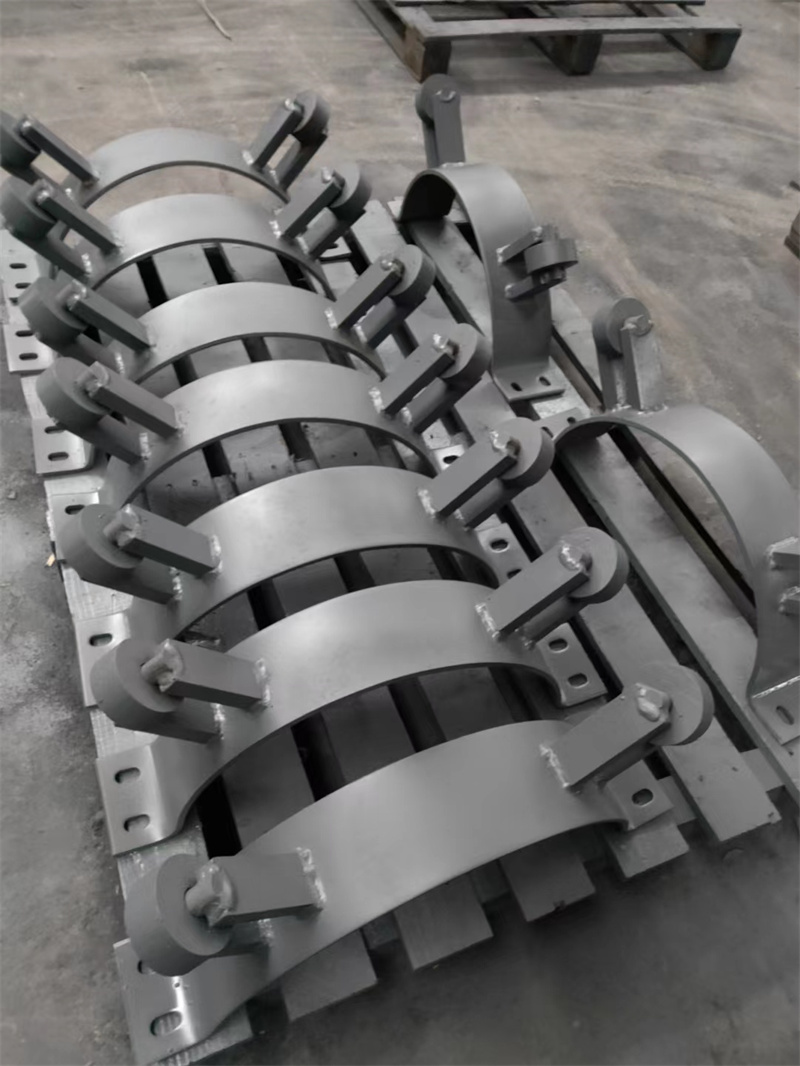 钢套钢滑动支架镁钢滑动支架,包括环形箍,环形箍外对称的设有四个支脚,四个支脚轮辐状的固定在环形箍上,支脚的末端分别连接有滚轮,滚轮的滚轴与环形箍的轴心线在空间上相互垂直;环形箍同轴线的安装在工作芯管的保温层外壁,滚轮与外管的内壁滑动接触;环形箍有三个同样的弧形段组成,弧形段两端分别设有连接头,连接头开有螺纹孔,螺纹孔内安装有螺栓和螺母;四个弧形段依次通过连接头组成一个完整的弧形结构;每个弧形段的中间位置固定连接一个支脚。